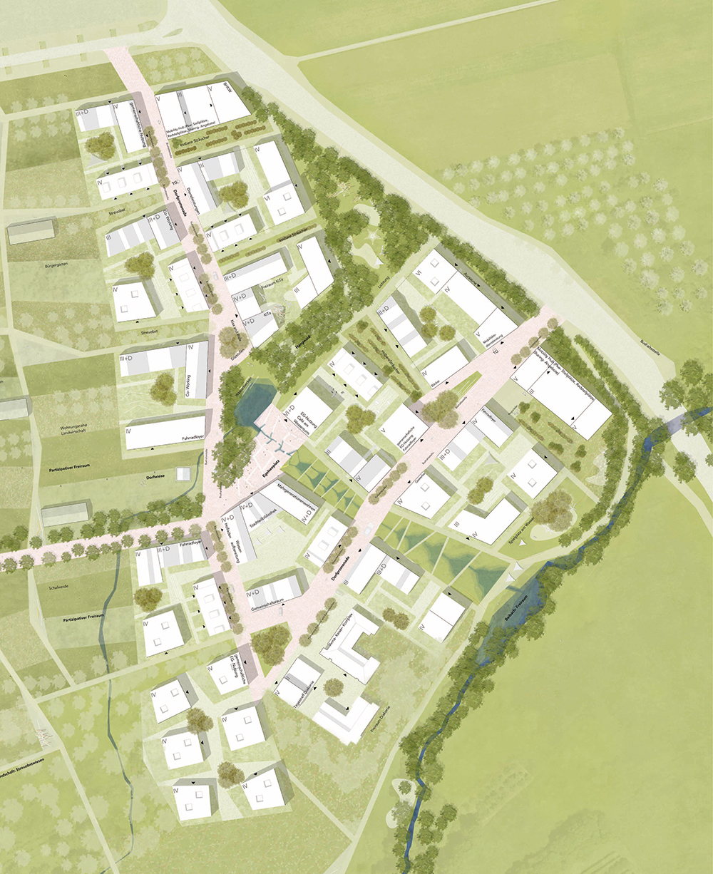 Brief descriptionThe neighbourhood is to be developed under the motto "Community Living in the Green". The advantages of urban and village life are combined and, in this way, a spatial idea suitable for the location is created. The building structure promotes the emergence of a social, integrative and inclusive neighbourhood. Different types of housing, developers and ownership find space on the building sites. Private residential uses, commercial uses, and public uses are complemented by community uses of all kinds. Generous open spaces run through the entire neighbourhood, linking it to the surrounding area and serving as additional places for people to meet and interact. The multifunctional areas also make an important contribution to promoting biodiversity and species diversity. The memory of previous uses in combination with a conscious and sustainable use of resources (sponge city) and thinking in cycles form the basis of this design. The sensitive handling of existing landscape elements, the cultural landscape and its preservation, forms the basis of the design, as well as the desire for networking with the two districts. Based on the local tree population and other landscape elements such as the Beibach and the typical orchard meadows, a quarter is formed that is embedded in the landscape and can be read. This functions as a link between the two parts of the village due to the good interlocking and networking of the open spaces as well as its programmatic enrichment. Inspired by the surrounding hilly landscape, different roof shapes adapt to it and break up the structural density and grain. Furthermore, the typical cultural landscape of scattered orchards and "Stückle" is incorporated into the area as an edible city. The areas between the construction fields will be planted with edible shrubs. Adjacent residents will take on sponsorships. The incorporation of open space elements such as the avenue to Rommelshausen, the formative woody structures in the area and the open space along the Beibach leads to the formation of three built-up clods. The areas between the clods are strengthened and further developed in their existing character and function. Together, they form the green backbone of the neighbourhood. For example, a green-blue experience space will be created in the area between Egelseeplatz and the Beibach River, demonstrating sustainable and ecological stormwater management. The open spaces are to be designed as ecologically valuable and multifunctional places with interspersed playgrounds and benches close to nature and serve all residents in the neighbourhood. The use and expansion of existing pathways in combination with new mobility options form the basis for a low-car-use neighbourhood. Cars are intercepted at the entrances to the neighbourhood in mobility hubs. All other trips in the neighbourhood can be made on foot, by bike or with shared cargo bikes. The village promenade, which is designed as shared space, connects all building sites. The new quarter is part of the IBA'27 network.
